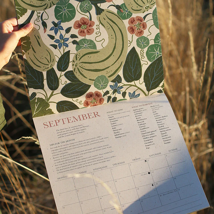 Alongside the illustrations, you’ll find expert growing tips written by Isla’s sister, Bryony Middleton, Head Gardener at the Sharpham Trust in Devon. From what to sow and harvest to reminders of lunar phases and seasonal festivals, this calendar helps you stay connected to the natural rhythms of the year.