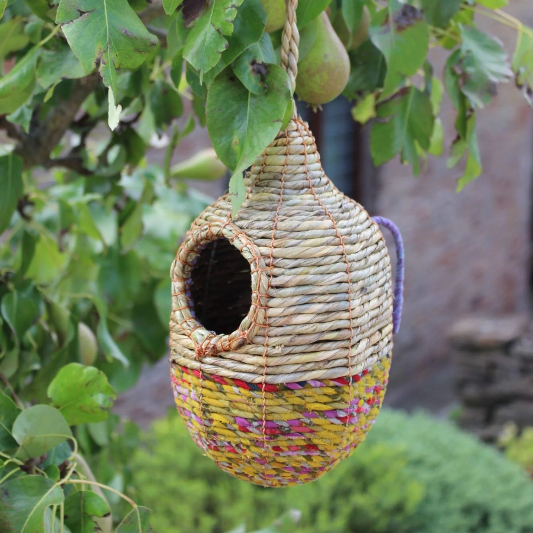 Support both wildlife and artisans in Southern Bangladesh with our Fair Trade bird house. Handcrafted using natural seagrass and vibrant recycled saris, each nester is a unique burst of colour, showcasing the artisan's individual touch.